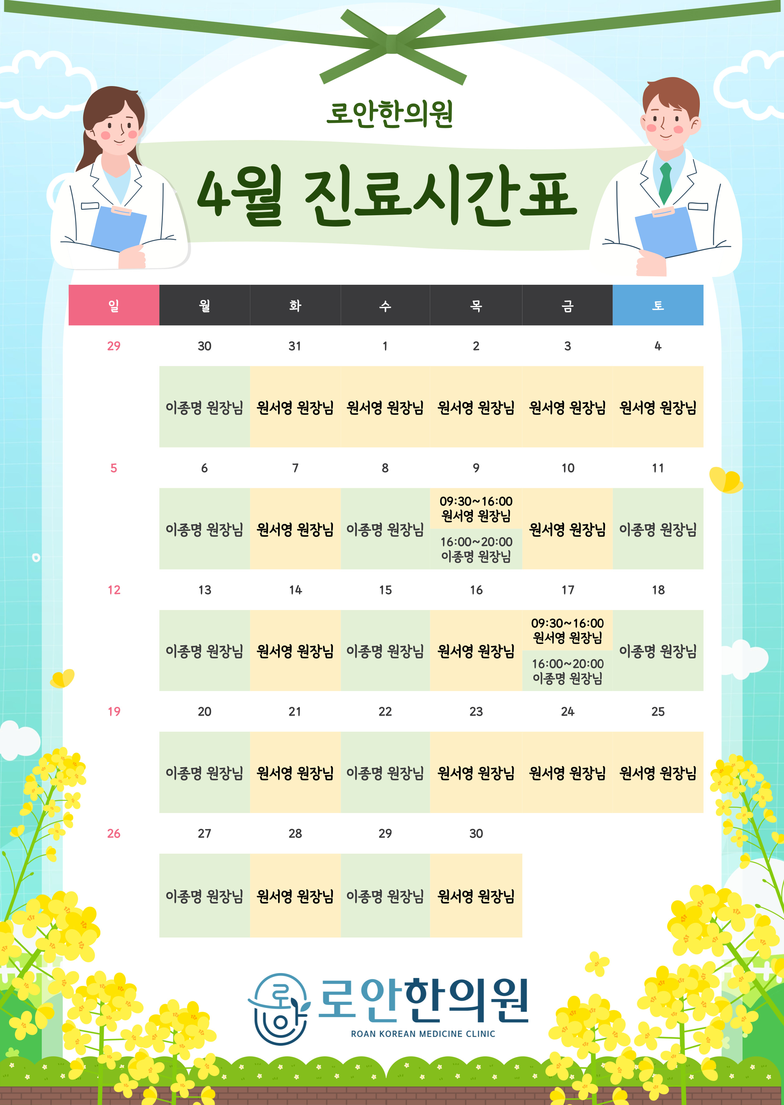 로안한의원 세종점 4월 진료시간표 안내